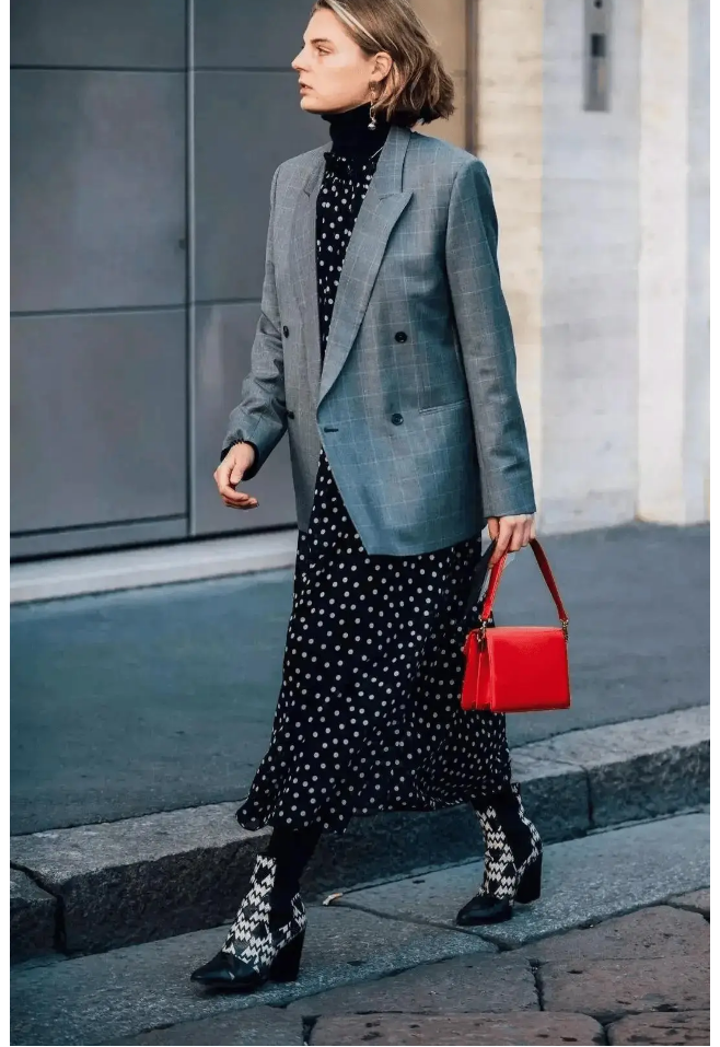-配色:黑西装+白底小雏菊半裙,经典法式;驼西装+焦糖棕波点长裙,复古暖调。