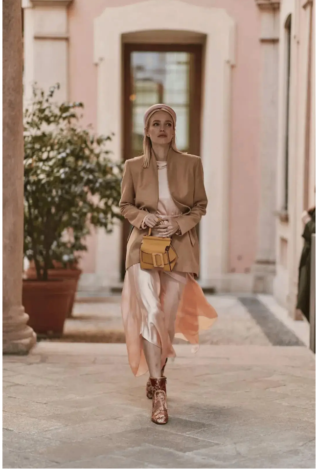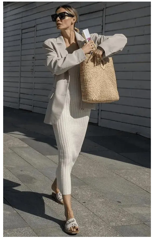 -配色:燕麦色西装+燕麦色针织裙,一身奶茶味;灰西装+鼠尾草绿针织裙,清冷高级。