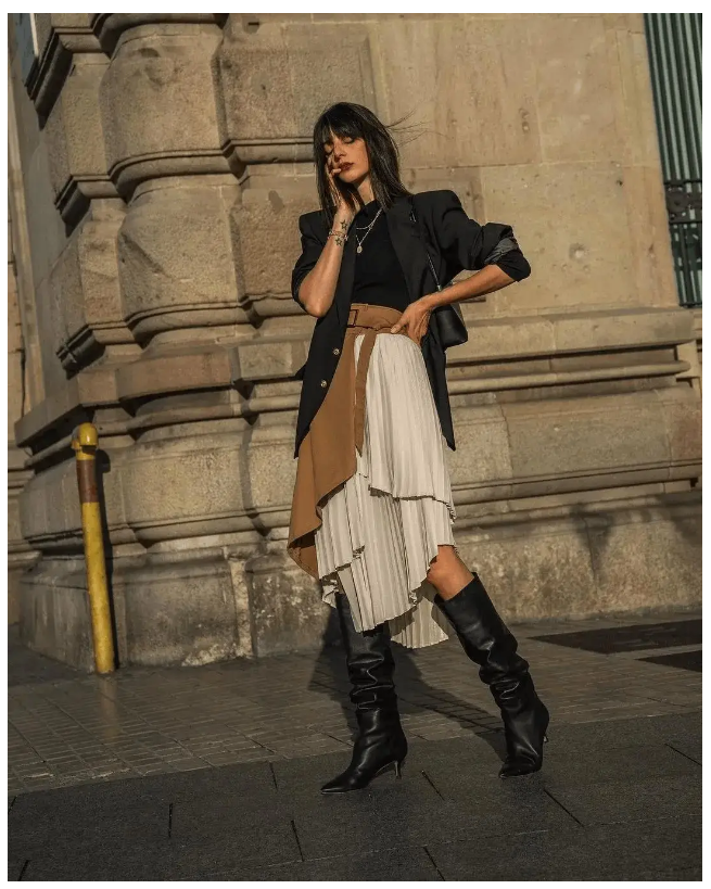 -配色:灰西装+雾霾蓝百褶裙,同色系不费力;想亮眼就白西装+克莱因蓝裙,配金色耳环,清爽不出错。